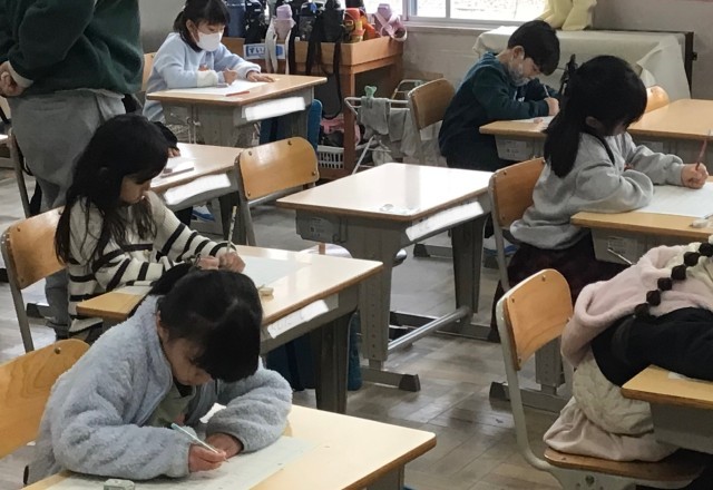 漢字の月例テストに取り組む1年生のみんなです。勉強の成果は出たかな?