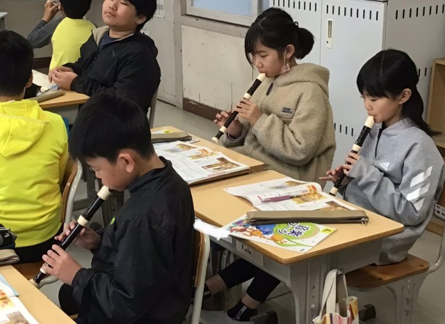 4年2組さん、音楽の授業を教室で行っていました。「ごんぎつね」をリコーダーで練...