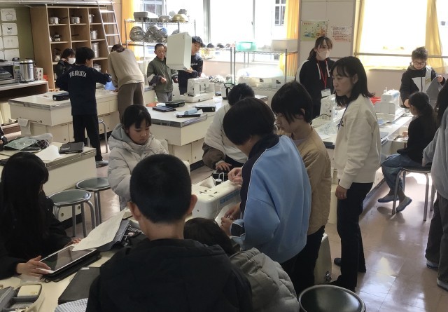 5年2組さん、家庭科の授業です。保護者ボランティアの方もお二人来てくださってい...