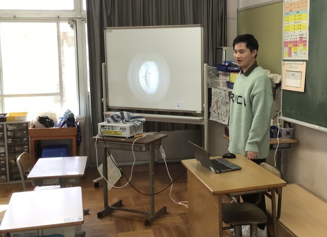 ALTの先生がスクリーンで野菜をさまざまな角度から映し出した映像を見せてくれま...