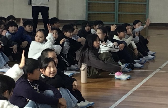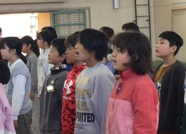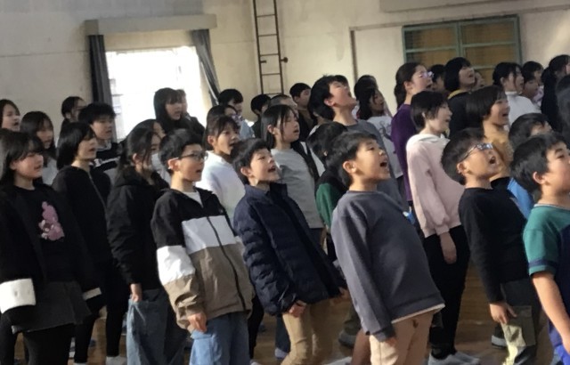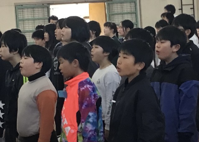 6時間目、体育館で卒業式に向けた在校生練習を行いました。先生が聞きます。「今、...