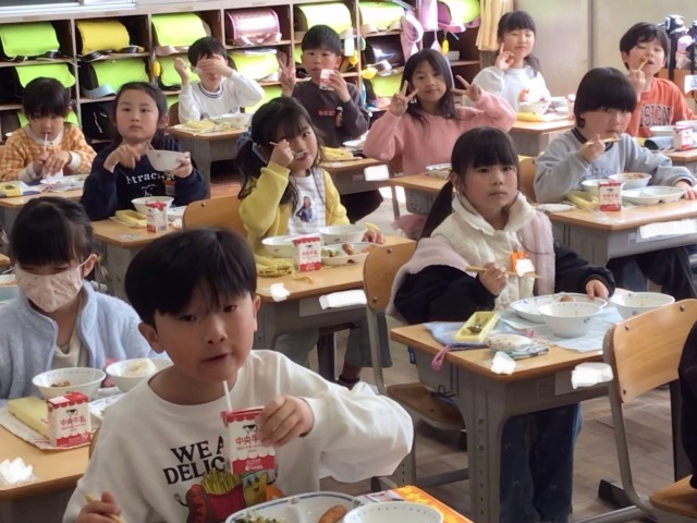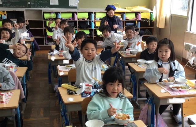 1年1組さん、今日の給食の様子です。木曜日が1~3年生は、お休みなので修了式ま...