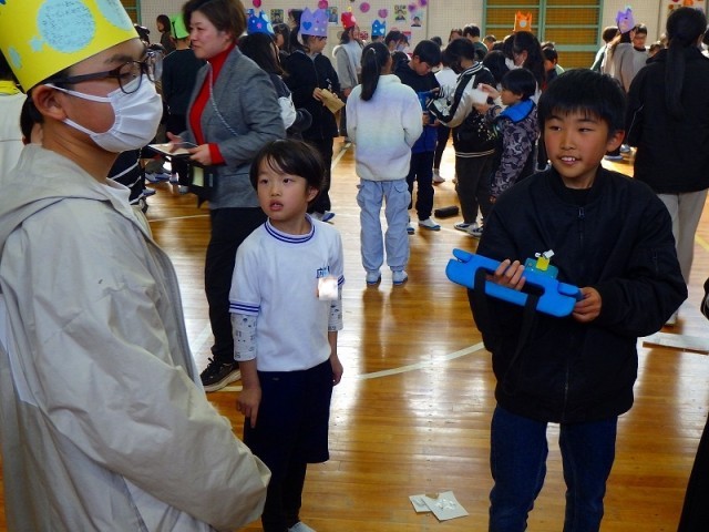 1年生の子が音楽の授業で習った楽器を使って、クイズ中のリズムを刻んだり、3年生...