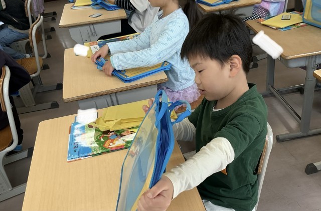 • 2年生 探検バックを確認中
