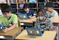 4年1組さん、学習用タブレットで勉強ができるように準備をみんなで進めていました...