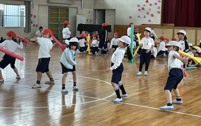 2年生、合同体育でボール投げの練習です。今日はロケットのような形をした軽い棒を...