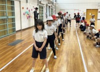 4年生、合同体育で体力テストの練習をしていました。4年生から始まる反復横跳びの...