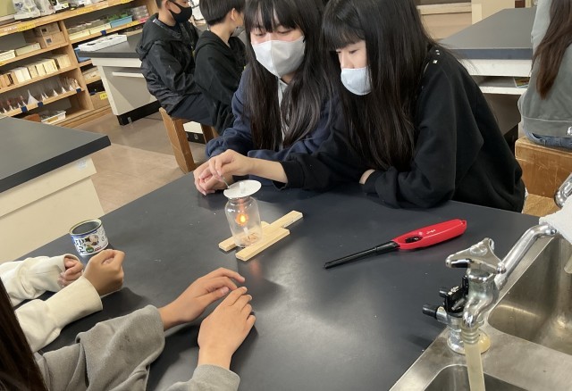 6年2組さん、理科の実験です。集気びんには、ろうそくが入っています。今日の実験...