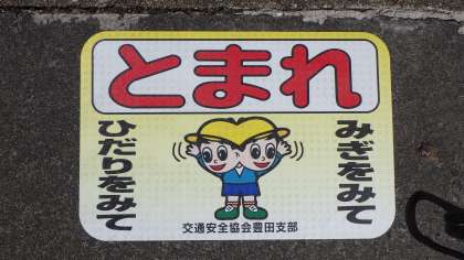 ○駐在所の方からいただいた「とまれ」のシールを地面に貼りました。