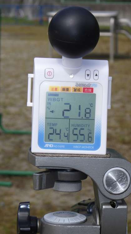 5月6日「WBGTの測定を始めました」 公開日 2021/05/06 更新日 2021/05/06 お知らせ ○5月に入り、熱中症への注意が必要な時期になってきました。 学校では感染症だけでなく熱中症にも気を付けています。 ○写真(上)のように、運動場に「熱中症指数モニター」を設置し、 日中の熱中症指数(WBGT)を計測しています。 〜ご家庭でも「感染症」「熱中症」にお気を付けください!〜
