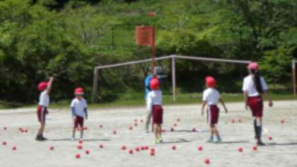 ○赤組も白組も、かごのほうに向けて、がんばって玉を投げていました。