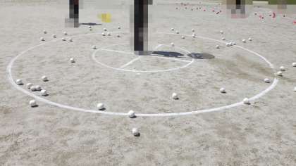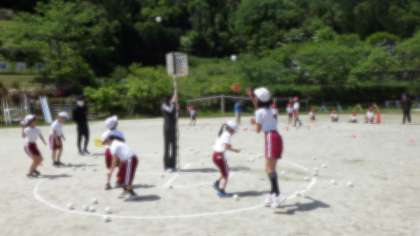 ○また、1〜3年は内側と外側の円の間から、4〜6年生は外側の円の外から玉を投げるようにしました。