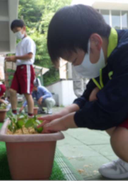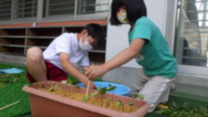 ○水につけておいた短い枝を、プランターの土に挿し、植えていきました。