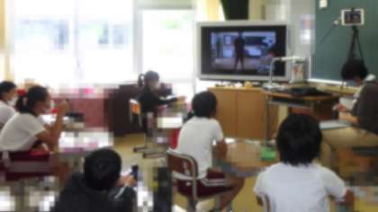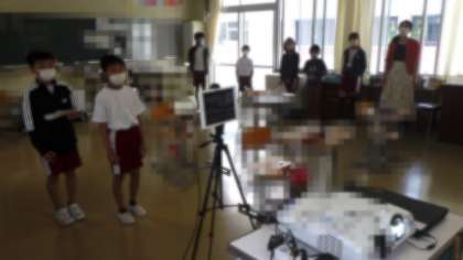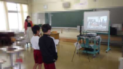○6年生教室と他学年の教室がつながり、映像と音声を共有すると、