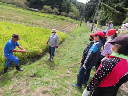〇地域講師Nさんに、稲刈りのしかたを教えていただきました。