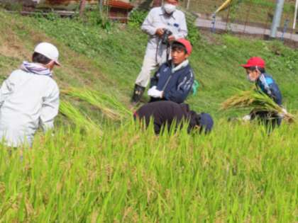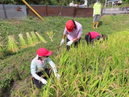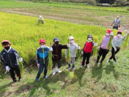 〇稲刈りのしかたを学んだ後で、子どもたちは実際に