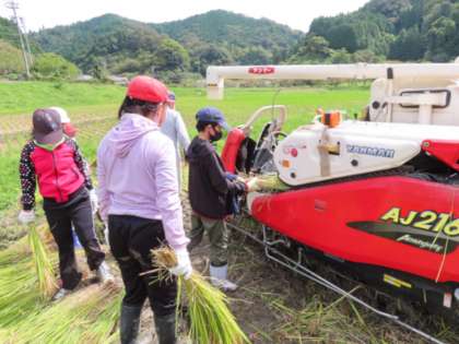 〇手刈りした稲をコンバインの横から入れる体験もできました。