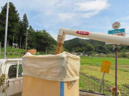 〇コンバインからかごに、収穫した籾を入れている様子です。