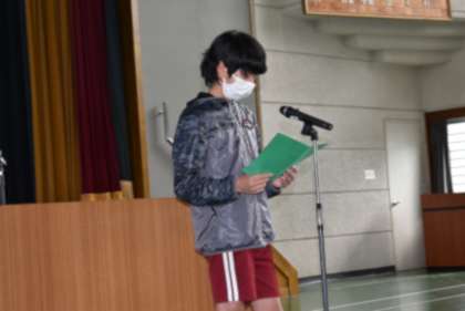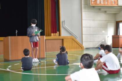 10月11日「前期終業式」-08 公開日 2021/10/13 更新日 2021/10/13 学校行事 【前期にがんばったこと・後期にがんばりたいこと】その3 ○6年生の代表は、最高学年としてがんばったことなどについて、 思いを込めて詳しく発表しました。