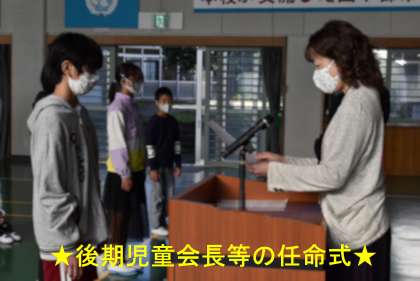 10月15日「任命式」 公開日 2021/10/15 更新日 2021/10/15 学校行事 【後期児童会長等の任命式】 〇後期の「児童会長」「各委員会の委員長」「学級代表」になった 子どもたちの『任命式』を行いました。 ※この続報は次週掲載予定です。