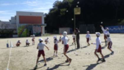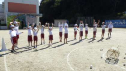 〇赤組も白組も、それぞれのかごをめがけて、玉を投げました。