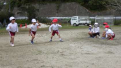 【徒競走の練習】 〇各学年ごとに3〜4人ずつ、スタートします。 〇低学年は、70mを走ります。