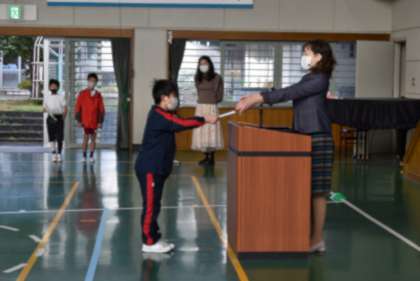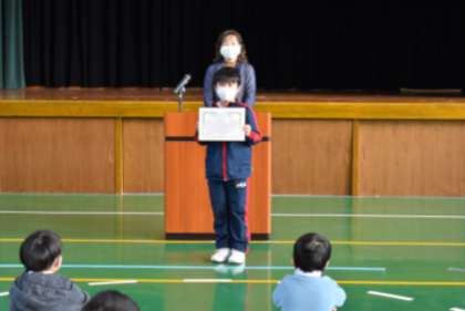 「校内入選」に選ばれた児童の表彰を、校長先生に
