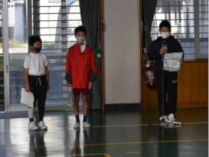 11月10日「全校集会」(4) 公開日 2021/11/15 更新日 2021/11/15 学校行事 【修学旅行いってらっしゃいの会】 ○5年生の子どもたちが中心となって、 修学旅行(11/11〜12)に出かける6年生を見送る会を 行いました。 ○はじめに、5年生が考えた「京都・奈良に関する○×クイズ」を 行った後に、5年生が作った「お守り」を手渡しました。 <写真・上> 司会をする5年生(右)、4年生(左) <写真・下> 修学旅行に出かける6年生たち