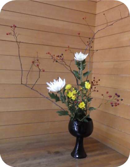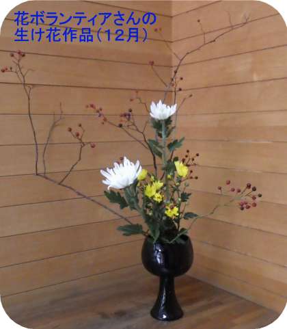 12月「花ボランティアさんの生け花」 公開日 2021/12/22 更新日 2021/12/22 学校の特色ある活動 【花ボランティア・Tさんの生け花作品】 〇12月は、主に菊を使って、冬らしい生け花作品を飾ってくださいました。 〜本城小のために毎月花を生けてくださり、ありがとうございます〜