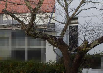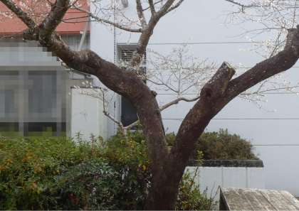 ○職員室と南校舎の間に立っている「四季桜」の幹に、たくさんのコケが付いていました。