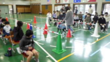 1月20日「福祉実践教室」(1) 公開日 2022/01/20 更新日 2022/01/20 学校行事 【福祉実践教室】その1 ○はじめに、全校児童と保護者、教員が、視覚障がいの方のお話を聞きました。 ○生活する上で工夫していること・困ること・盲導犬のことなどについて、 具体的に話してくださいました。
