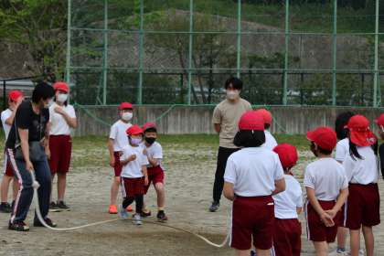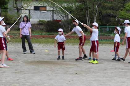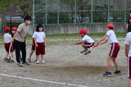1〜6年生が一つのチームになって縄を跳んでいく。1年生にとっては初めての8の字跳び練習。きっと回っている縄を目の前にして、とっても不安だった子もいたでしょう。5・6年生が1年生の肩に手を置いて、タイミングをとってあげたり、いっしょに跳んであげたり、こんな背中を押してくれるおにいちゃん、おねえちゃんがいるからこそ、勇気をもって飛び込める。縄が足に当たったり、引っかかって転んでしまったり・・・。