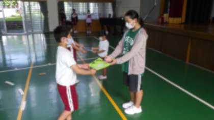 ○次に、みんなで「ハッピーバースデー」の歌を歌い、お祝いしました。そして、代表の子たちから、手作りの「誕生日カード」を渡しました。