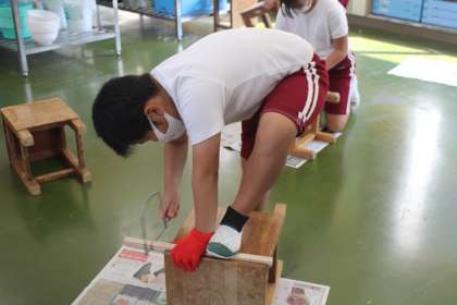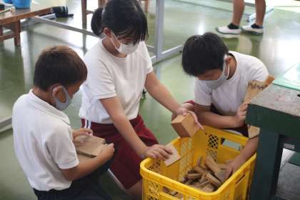 木材を使っての作品づくりが始まりました。「何を作るの?」との質問の答えに迷ってしまう児童は誰もいませんでした。「早く作りたい」という気持ちを押さえきれない様子の児童ばかりでした。今からどんな作品が完成するのか楽しみです。