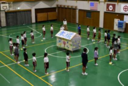 〇6年生が中心となって、全校児童で制作を進めてきた「あんどん」が、今週完成しました。そこで、今日(9月30日)、全校児童が集まり、お披露目会を行いました。