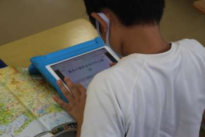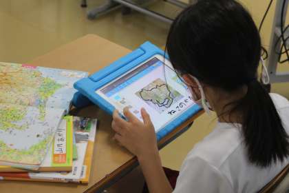 本時では、個人からペア、そして全体という学習形態の流れのなかで、「愛知県の地図を見て、気付いたことを書こう」という課題に向き合う授業でした。個人での学びでは自分の考えをまとめ、ペアでの学びでは新たな気付きを追加し、全体での学びでは、次時の深める学習に向けた個別の目標づくりに役立てることを目指しました。