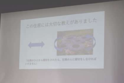 〇「親切にされた場合」の日本での慣習、他の国での慣習の2つを取り上げながら、「正しい答えは一つとは限らない」ということを話されました。