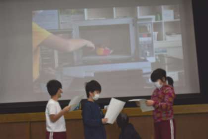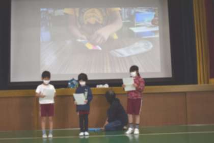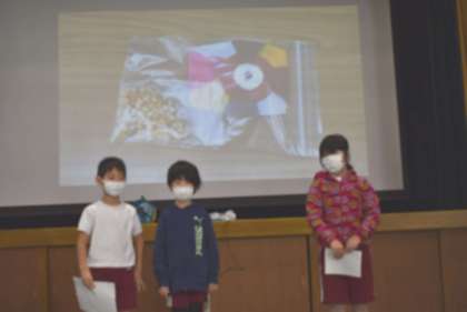○2年生は自分たちで育て収穫し乾燥させた「ポップコーンの実」を全校のみんなにプレゼントすることをお知らせました。