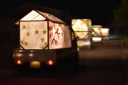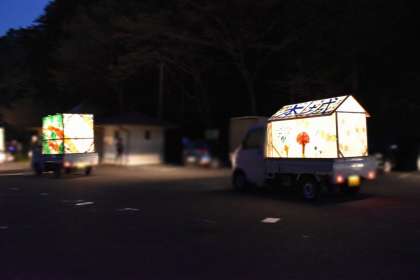 10月1日「軽トラあんどんパレード」その2 公開日 2022/10/26 更新日 2022/10/26 特色ある学校づくり推進事業 ○約20台の軽トラあんどんが一列になって小原の各地区を回りました。 (午後6時ごろ、和紙のふるさと駐車場を出発していきました。)