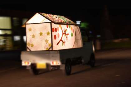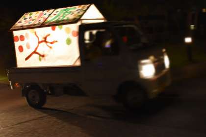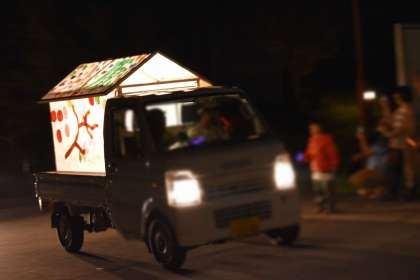 ○本城小の軽トラあんどんが、小原の道を走っているときの様子です。