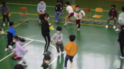○はじめに、集団ゲーム「なんでもバスケット」をしました。