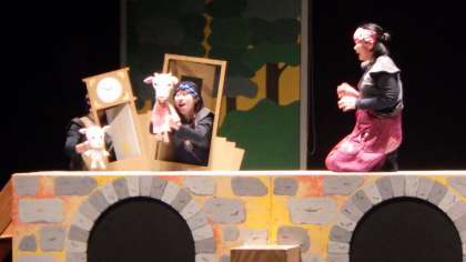 ○概要…グリム童話の「オオカミと7匹の子ヤギ」「カエルの王さま」「しあわせハンス」を原作にして、ぐりむばあやと童話の主人公たちが歌とダンスで楽しく物語を展開する劇でした。