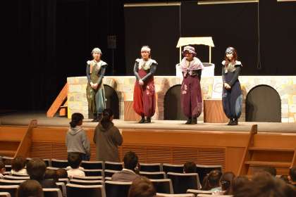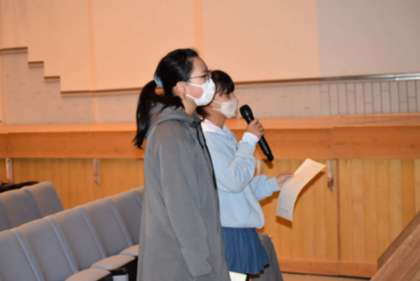 ○約1時間の演劇が終わり、「閉会行事」の場で、本城小6年生・2名が3校の代表として「お礼の言葉」を述べました。
