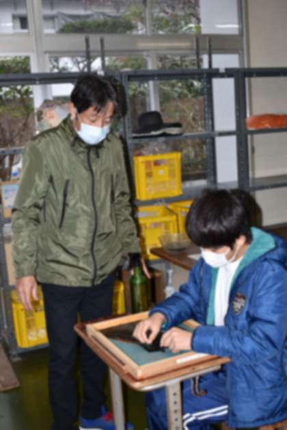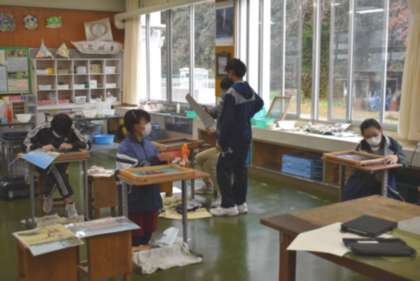 ○子どもたちは、和紙講師のF先生から「漉き方のこつや技法」を学ぶとともに、自分で工夫しながら小学校最後の作品づくりを進めています。