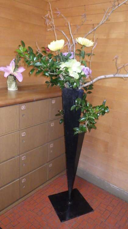 【花ボランティア・Tさんの生け花作品】(本城小の玄関)
