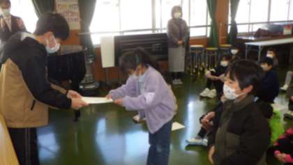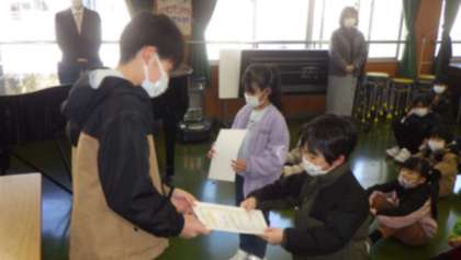 2月27日「集会」その4 公開日 2023/02/27 更新日 2023/02/27 学校行事 【完読賞】(ほんわか委員会による表彰) ○1年生、2名が表彰されました。 〜進んで読書ができ、すばらしいですね!〜