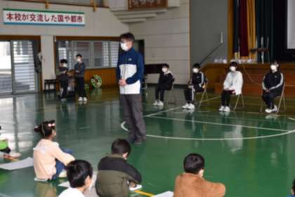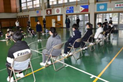 ○校長先生の話、在校生代表(5年生)の話を聞く在校生と卒業生。