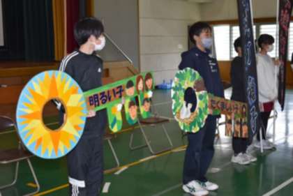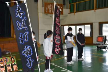 ○6年生から下級生に「校訓の鍵」「打ちはやしの旗」が引き継がれました。