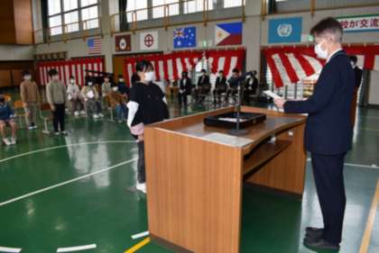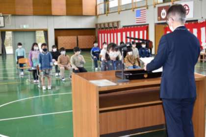 〇5年生・4年生・3年生の代表児童に、校長先生から「修了証」が渡され