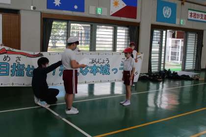 運動会に向けて、最初の全体練習の場で、今年度のテーマが発表されました。「目指せ!!元気な本城っ子!」…4年生の山内 茜璃さんのアイデアによるものです。「今日から運動会に向けての練習がスタートしますが、大切なことは、運動会本番だけでなく、練習から元気いっぱいに取り組むことです」という力強い言葉が6年児童によって添えられました。